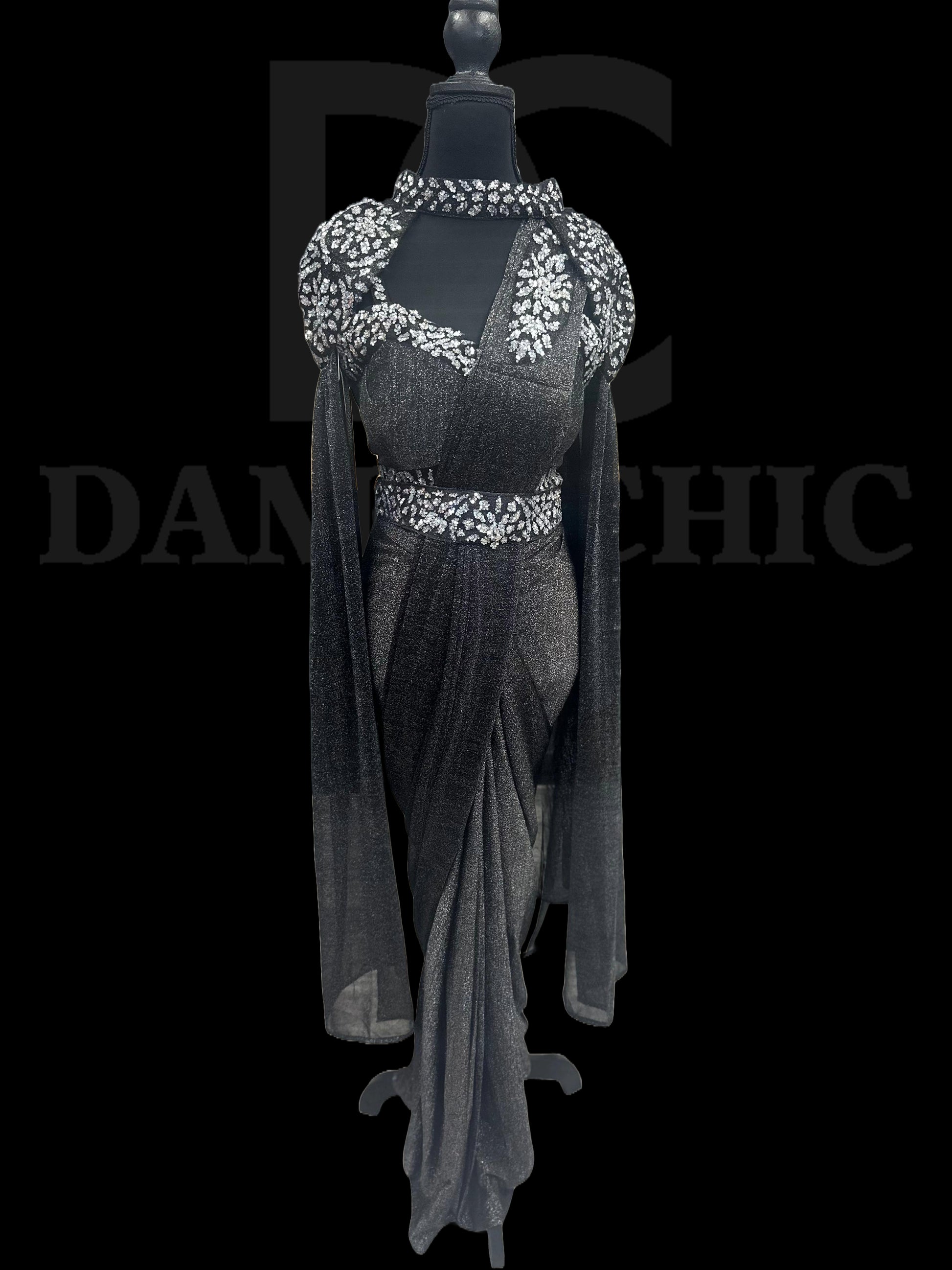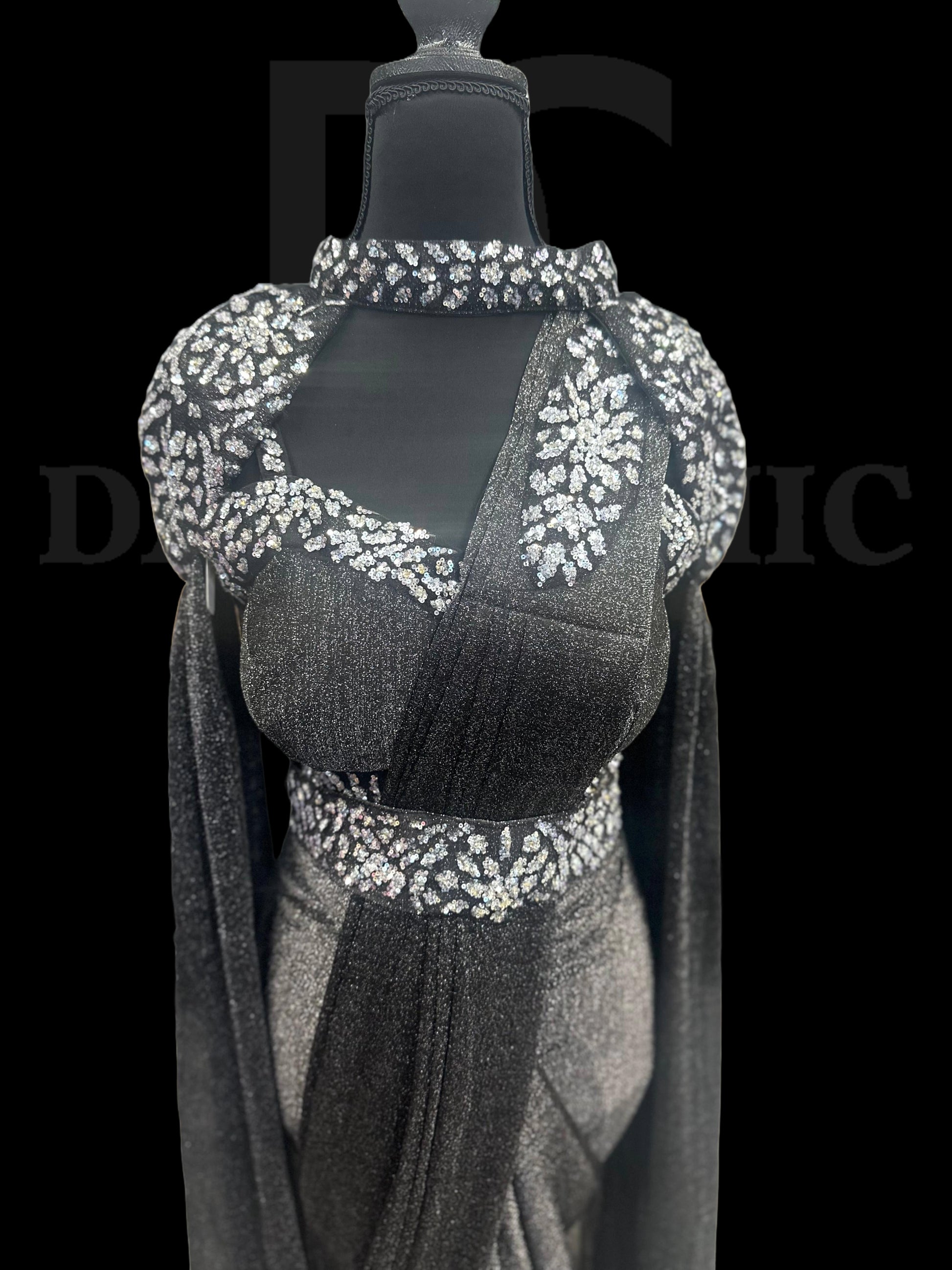 You need a 'showstopper' for that reception, but a traditional saree feels too fussy and a Western gown feels... disconnected. This is your answer. A pre-draped shimmer saree in striking black, anchored by a stunning, hand-embellished belt and neckline. It's the devastating glamour of a black-tie gown with the soul of a saree, ready in minutes.